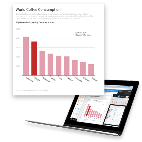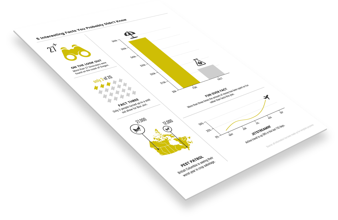 Visualiza tu información con gráficos y textos. Mejora tu infografía añadiendo imágenes e íconos de nuestra biblioteca.