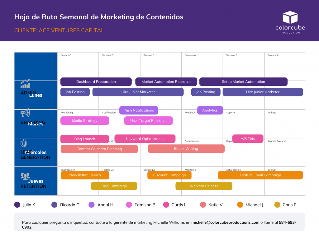 - Hoja de ruta de marketing: organiza campañas, contenidos y estrategias de comunicación visual.