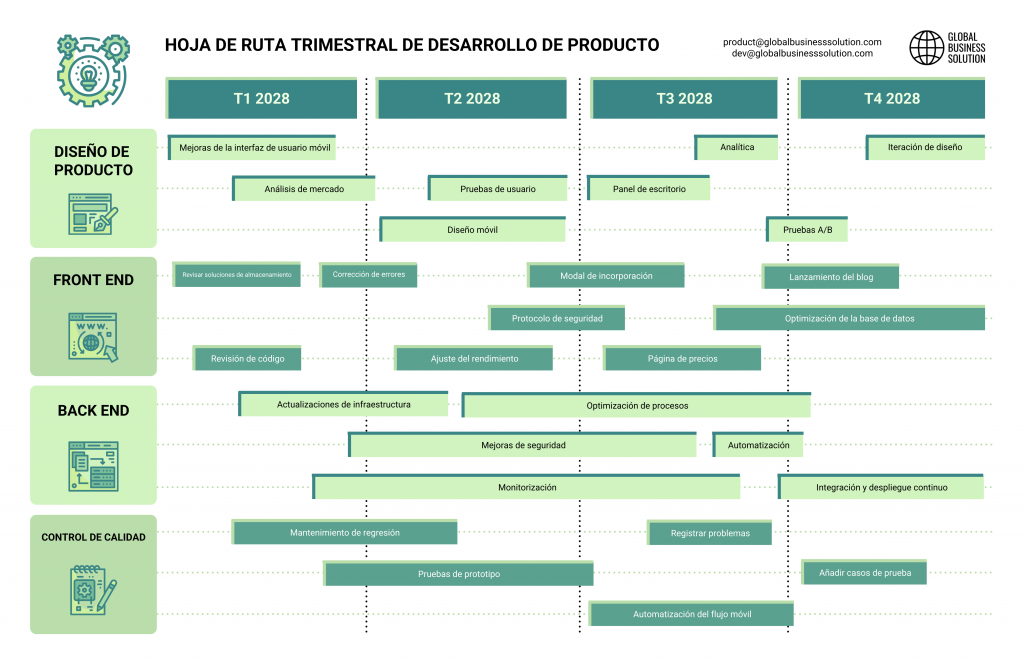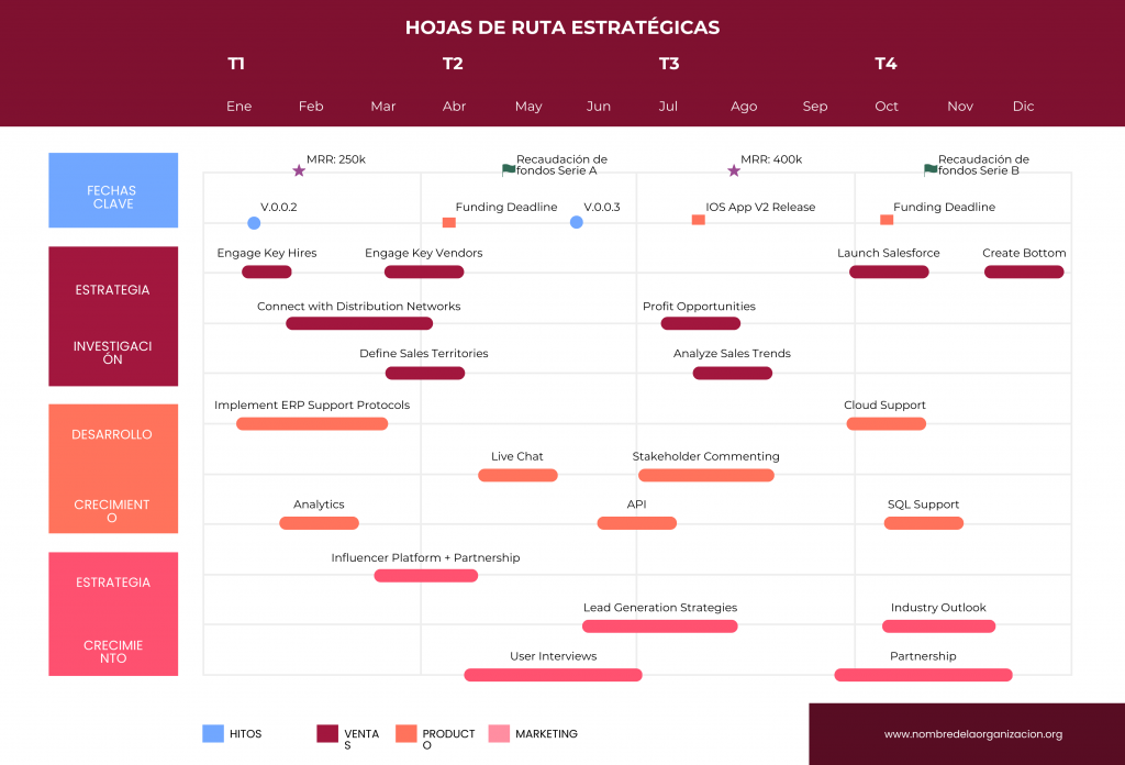 - Hoja de ruta de producto: ideal para startups o equipos de desarrollo. Muestra lanzamientos, mejoras y fases del ciclo de vida del producto.