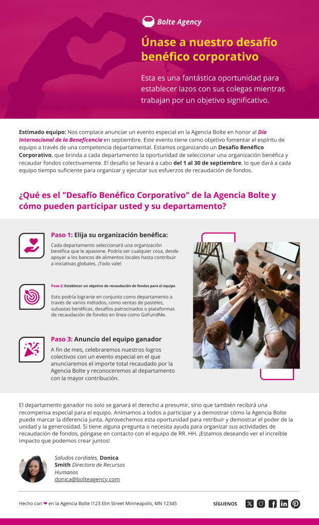 - Interna: usada dentro de las organizaciones para comunicar logros, aniversarios o políticas internas. Favorece la cohesión y la transparencia entre equipos.