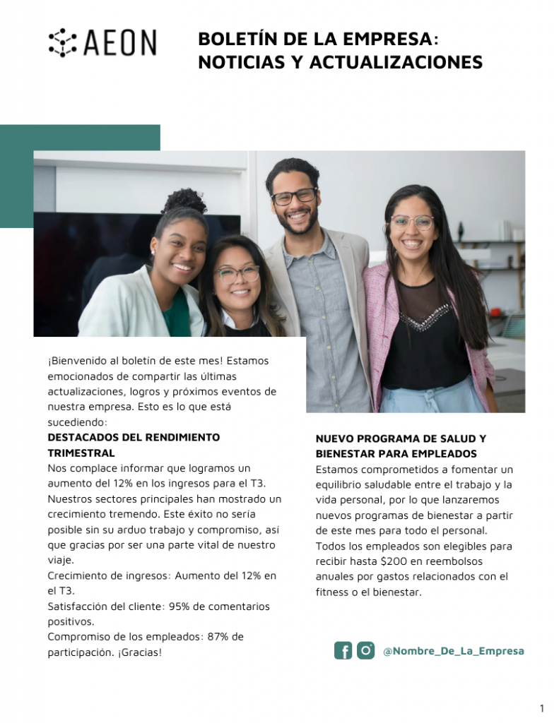 - Informativa: perfecta para compartir noticias de la empresa, avances de proyectos o novedades del sector. Su estructura es limpia y jerárquica, priorizando texto sobre imágenes.