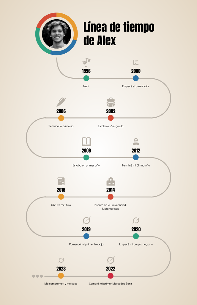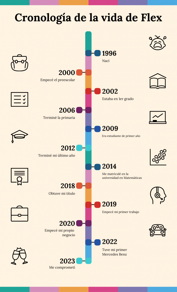 - Histórica: Es la más tradicional y una de las favoritas en el ámbito educativo. Sirve para mostrar la evolución de hechos, movimientos o personajes a lo largo del tiempo. Perfecta para clases, infografías informativas o proyectos culturales donde el contexto importa tanto como la fecha.