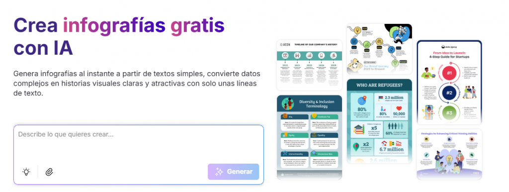 | Ahorro de tiempo | Automatiza tareas como resumir, sugerir diseños o generar contenido inicial. | Permite crear una infografía más rápido, incluso sin experiencia previa. |