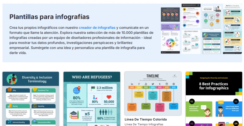 | Elección de plantilla | Sugiere diseños ya estructurados según el tema de la infografía. | Evita empezar desde cero y facilita crear una base visual atractiva. |