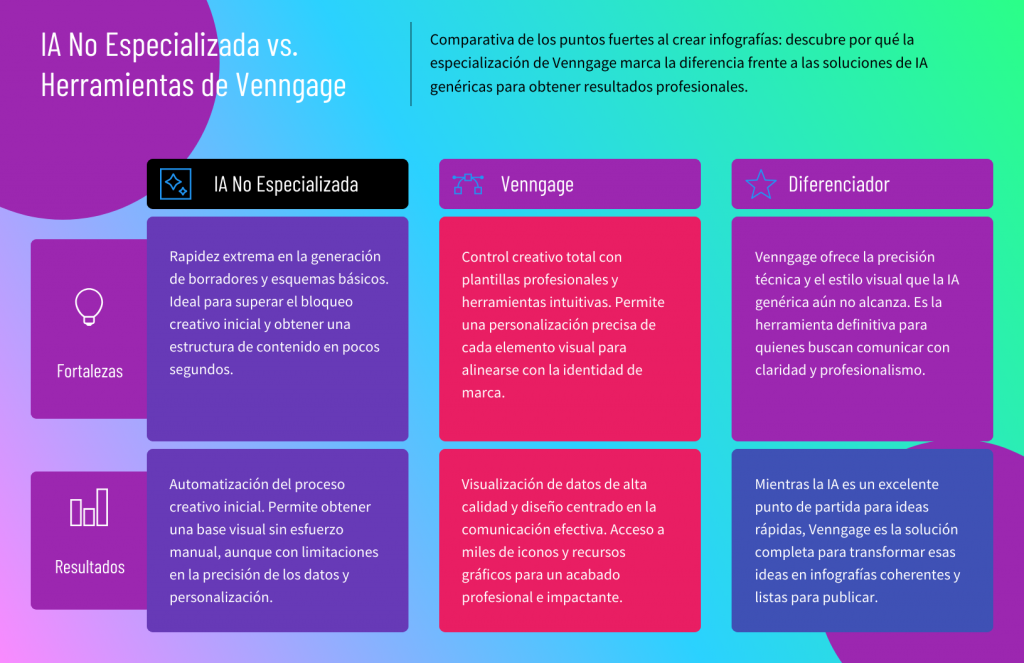 Aquí es donde herramientas especializadas, como el Generador de Infografías con IA de Venngage, marcan una diferencia real. A diferencia de las IA genéricas que generan diseños cerrados o difíciles de editar, esta herramienta está entrenada específicamente para crear infografías con estructura clara, jerarquía visual y bloques listos para personalizar. Venngage menciona que “una buena infografía empieza con claridad, no con decoración” y nuestra IA está construida justo sobre ese principio.