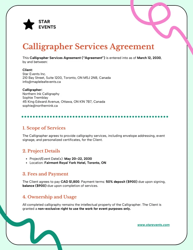 La plantilla de contrato para calígrafos está diseñada para agilizar tus compromisos artísticos con estilo y profesionalismo. Ya sea que estés trabajando en invitaciones de boda, letreros de eventos o encargos de arte personalizados, esta plantilla garantiza que cada detalle esté claramente establecido, protegiendo tanto tu tiempo creativo como los intereses de tus clientes. Destacando términos como alcance del proyecto, plazos y calendarios de pago, está diseñada para establecer expectativas transparentes desde el principio. ¡Esta plantilla es el diseño ideal para promocionarte y dar a conocer tu trabajo! En Venngage, la personalización está al alcance de tus manos: agrega un toque de color para que coincida con tu marca personal, ajusta los tamaños a tu gusto o selecciona imágenes perfectas de nuestras amplias y gratuitas bibliotecas de imágenes. Con esta herramienta dinámica, personaliza tu diseño ideal fácilmente, asegurándote de que cada acuerdo no sea solo un.